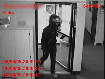 The suspect is described as male about 6’0” tall. He was wearing a motorcycle helmet, black leather jacket, and black gloves.