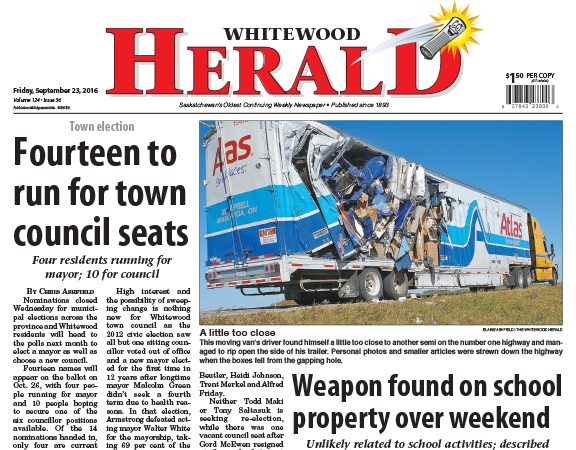 Inside this issue: - Fourteen to run for town council seats - Weapon found on school property over weekend - Four names submitted for mayor’s seat - Terry Fox Run raises $6,000 - Esterhazy man arrested for child pornography - Co-op to cut ribbon to open new c-store in Whitewood - Awards handed out for […]