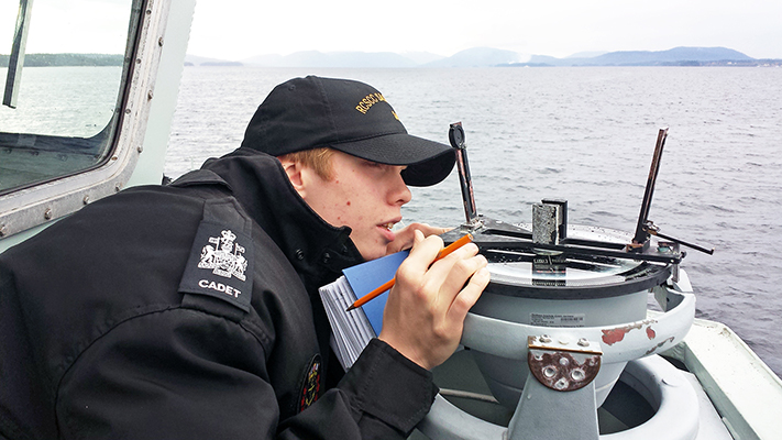 Sea Cadet Connor Phillips recently spent a week at sea with the Royal Canadian Navy (RCN) on board the Patrol Craft Training Vessel (PCT) Moose. Cadets on board learned basic seamanship skills including; helmsman, lookout, navigation, line handling, steering gear breakdowns, and firefighting. Left: Cadets rescue a mannequin overboard. Above: Cadet Phillips plots a fix aboard PCT Moose. Submitted photo