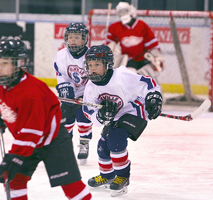 Melville novice Millionaires players got to strut their stuff in their home tournament last weekend. Here, team members Tristan Stewart and Xavier Doane break out of their own end in a game against the Weyburn Red Wings.