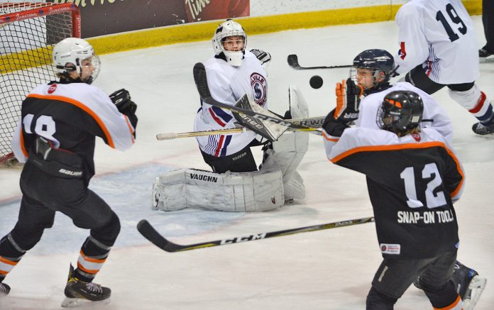 Midget Chiefs netminder scrambles to get back into position as he’s surrounded by Yorkton Terriers at the Chiefs’ home opener on Oct. 29. The Chiefs and Terriers finished in a 5-5 draw.