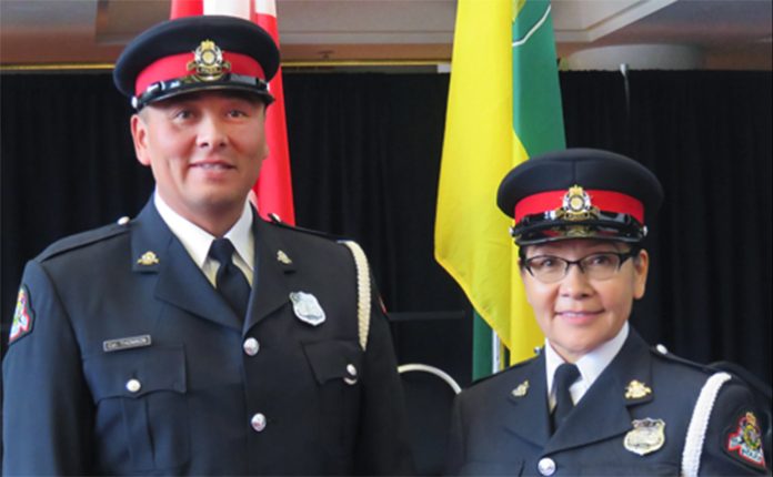 File Hills First Nations Police Service Const. Justin Thomson received his badge from badge from his mother, Cpl. Carol Thomson, who is also a serving member of the FHFNPS.