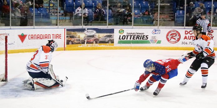 Melville’s Tristan Shewchuk just misses scoring a short-handed goal on Yorkton’s goalie, Ben Laidlaw, as defender Colby Brandt comes in on the play. The Millionaires were fighting off a double minor and trying to add to a one-goal lead. They defeated the Terriers 4-2 on Jan. 1. Photo by George Brown