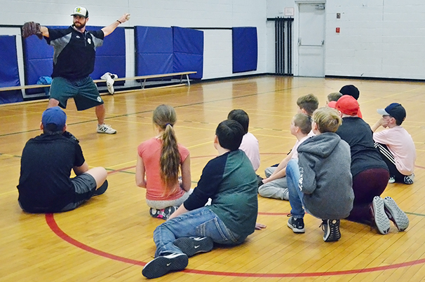 Ball clinic - Guest instructor Blaine Kovach from Baseball Sask. demonstrates proper pitching form during a clinic with Grenfell Minor Ball players on Feb. 28. The indoor clinic was the third one held this year and saw approximately a dozen young players participate.