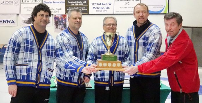 The champs. Tournament chair Larry Peterson (R) presents the trophy to Bruce Korte. Team Korte is lead Rory Galanowski, second Kary Kohuch and third Darrell McKee.