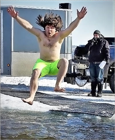 RCMP Const. Dylan leaps into bone chilling waters for the last time in the Fort’s annual Polar Bear Dip. Photo by Dave Sabirsh