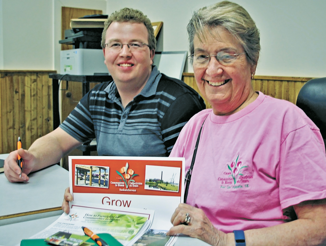 Communities in Bloom’s Andrew Exelby confers with Fort Qu’Appelle representative, Marie Bill. “It’s not just about flowers.”