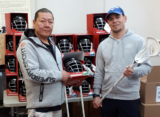Chief Rodger Redman (L) and Standing Buffalo council have purchased new helmets, bags and lacrosse gloves for all the players and paying the registrations fees. Jeff Shattler, Saskatoon Rush all-star and 2018 NLL champion and MVP of playoffs, hosted lacrosse camps with all of the lacrosse teams. Submitted photo