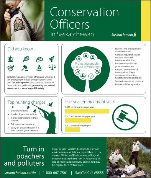 If you suspect wildlife, fisheries, forestry or environmental violations, please call your local Ministry of Environment office, Saskatchewan’s toll-free Turn in Poachers and Polluters line at 1-800-667-7561 or #5555 for SaskTel cellular subscribers, or report a violation online at www.saskatchewan.ca/tip.