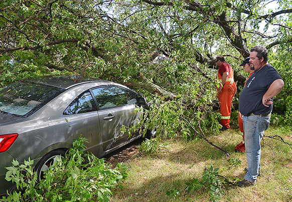 Storm aftermath - Scott Brown, along with city workers, look at the damage done to his daughter’s car after a sudden wind and rain storm on July 13 knocked a tree down on top of it while it was parked on Saskatchewan Street in Melville. The car received extensive damage with the roof and hood crushed and windshield smashed. (Photo by Chris Ashfield)