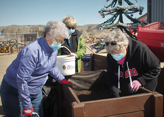 Digging deep - Bloomers Dorothy Chickowski (left), Maureen Labrash (center) and councillor Connie Wowchuck (right) prepare the new flower boxes that will beautify the community for spring planting.