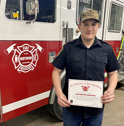 Award of recognition - Junior firefighter Jaxon Finkas was presented with a certificate of recognition from the Whitewood Fire Department for his actions on May 23 in which he performed CPR on a person on Highway 1, just months after being certified.