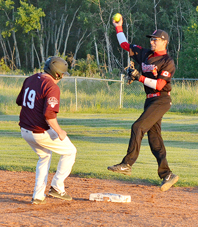 Mens’ fastball - Round Lake Braves’ second baseman Dan Watson does a throwing jump as he tries to make a double play after getting Grenfell Gems Nathan Bender (19) out. The Gems beat the Braves 11-0 on June 14.