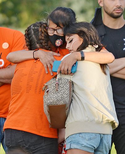 Cowessess vigil - A group of people hug and console each other during a vigil that was held in the community of Marieval on the Cowessess First Nation on June 26. The event was held at the cemetery where 751 unmarked graves had been discovered. The grave’s original headstones had been removed in the 1960’s.