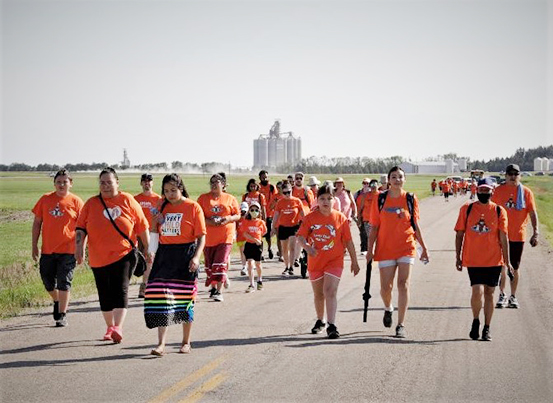 11 km walk - More than 100 people walked 11 km into Lebret, SK on Canada Day in memory of children who died in residential schools.