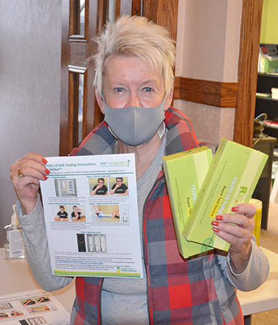 COVID kits - People were lined up at Melville City Hall on Monday to get a free rapid antigen self-testing kit. Inside City Hall, Melville & District Chamber of Commerce Carol Wiens (right) displays the kits and information sheet that is handed out.