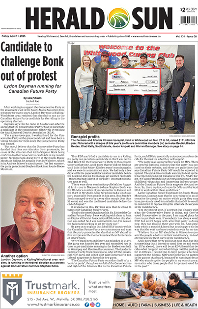 Home Herald Sun Herald Sun PDF Edition Whitewood-Grenfell Herald-Sun – April 11, 2025 Whitewood-Grenfell Herald-Sun – April 11, 2025 By Grasslands News Group - April 10, 2025 RELATED ARTICLESMORE FROM AUTHOR Whitewood-Grenfell Herald-Sun – May 1, 2026 Whitewood-Grenfell Herald-Sun – April 24, 2026 Whitewood-Grenfell Herald-Sun – April 17, 2026 Provincial News Five arrested in major drug bust Ryan Kiedrowski - April 27, 2026 NOTE: Grasslands News will have more on this developing story in this week's paper and online. RCMP have provided the following release with regards... Bangor, Yorkton, and two rural residences raided April 30, 2026 CURRIE – Bonnie April 29, 2026 SCHINDEL – William April 29, 2026 Fort Qu’Appelle Times – May 1, 2026 April 30, 2026 Special Sections Hats Off To Our Local Heroes – October 11, 2024 October 10, 2024