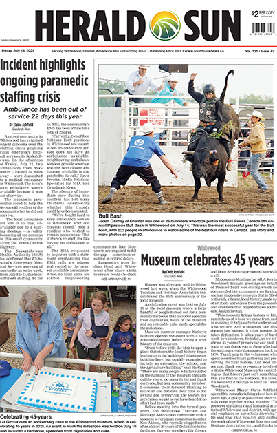 Home Herald Sun Herald Sun PDF Edition Whitewood-Grenfell Hersld-Sun – July 18, 2025 Whitewood-Grenfell Hersld-Sun – July 18, 2025 By Chris Ashfield - July 17, 2025 RELATED ARTICLESMORE FROM AUTHOR Whitewood-Grenfell Herald-Sun – April 17, 2026 Whitewood-Grenfell Herald-Sun – April 10, 2026 Whitewood-Grenfell Herald-Sun – April 3, 2026 Provincial News LAUTNER – Shirley Ann Grasslands News Group - April 15, 2026 It is with profound sadness we announce the passing of Shirley Ann on April 8, 2026, after a long courageous battle with cancer. Born May... New plant will provide clean water to a growing community April 16, 2026 ULMER – Matthew (Matt) Henry April 15, 2026 Fort Qu’Appelle Times – April 17, 2026 April 16, 2026 Melville Advance – April 17, 2026 April 16, 2026 Special Sections Hats Off To Our Local Heroes – October 11, 2024 October 10, 2024