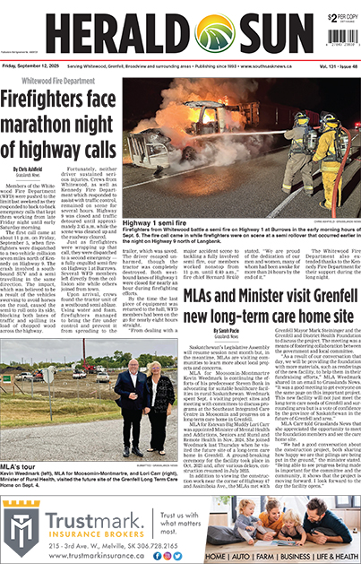 Home Herald Sun Herald Sun PDF Edition Whitewood-Grenfell Herald-Sun – September 12, 2025 Whitewood-Grenfell Herald-Sun – September 12, 2025 By Grasslands News Group - September 11, 2025 RELATED ARTICLESMORE FROM AUTHOR Whitewood-Grenfell Herald-Sun – September 26, 2025 Whitewood-Grenfell Herald-Sun – September 19, 2025 Whitewood-Grenfell Herald-Sun – September 5, 2025 Provincial News Man dies in rollover after fleeing from RCMP Chris Ashfield - August 25, 2025 A British Columbia man is dead following a single-vehicle rollover near the intersection of Highway 14 and Highway 675, west of Unity, on Saturday,... Standing Buffalo First Nation charts its own course July 22, 2025 10-year-old killed in ATV rollover near Bredenbury May 28, 2025 Man dies in RCMP custody in Carlyle December 13, 2024 Warrants issued for two men in connection with death on White... December 6, 2024 Special Sections Hats Off To Our Local Heroes – October 11, 2024 October 10, 2024