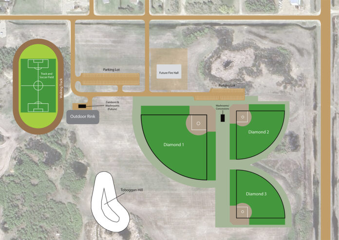 A concept map showing where the lot for the new fire hall (center) will be developed in relation to the new recreation park that is being constructed on the town’s south quarter.