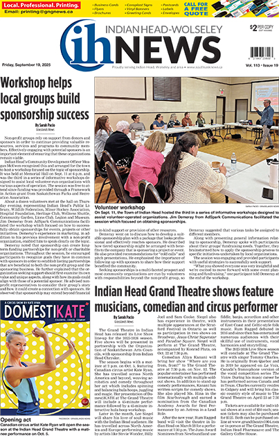 Home IH News IH PDF Edition Indian Head-Wolseley News – September 19, 2025 Indian Head-Wolseley News – September 19, 2025 By Grasslands News Group - September 18, 2025 RELATED ARTICLESMORE FROM AUTHOR Indian Head-Wolseley News – September 26, 2025 Indian Head-Wolseley News – September 12, 2025 Indian Head-Wolseley News – September 5, 2025 Provincial News Man dies in rollover after fleeing from RCMP Chris Ashfield - August 25, 2025 A British Columbia man is dead following a single-vehicle rollover near the intersection of Highway 14 and Highway 675, west of Unity, on Saturday,... Standing Buffalo First Nation charts its own course July 22, 2025 10-year-old killed in ATV rollover near Bredenbury May 28, 2025 Man dies in RCMP custody in Carlyle December 13, 2024 Warrants issued for two men in connection with death on White... December 6, 2024 Special Sections Hats Off To Our Local Heroes – October 11, 2024 October 10, 2024