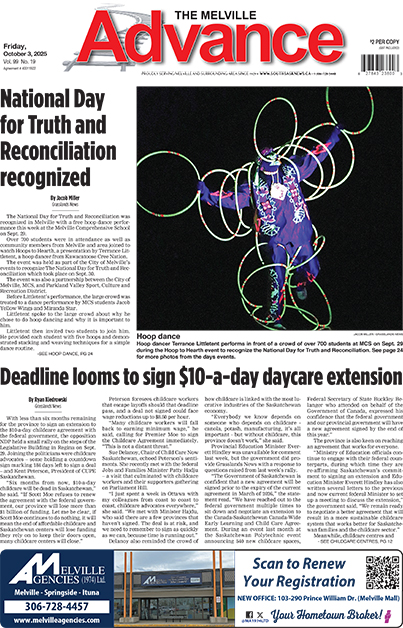 Home Melville Advance Melville Advance PDF Edition Melville Advance – October 3, 2025 Melville Advance – October 3, 2025 By Grasslands News Group - October 2, 2025 RELATED ARTICLESMORE FROM AUTHOR Melville Advance – September 26, 2025 Melville Advance – September 19, 2025 Melville Advance – September 12, 2025 Provincial News Notice to Subscribers: Canada Post Strike Chris Ashfield - October 3, 2025 Due to the Canada Post strike, we have made alternate arrangements for subscribers who receive their newspaper through the mail to ensure you don’t... Man dies in rollover after fleeing from RCMP August 25, 2025 Standing Buffalo First Nation charts its own course July 22, 2025 10-year-old killed in ATV rollover near Bredenbury May 28, 2025 Man dies in RCMP custody in Carlyle December 13, 2024 Special Sections Hats Off To Our Local Heroes – October 11, 2024 October 10, 2024