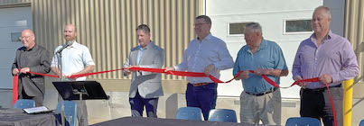 Ribbon cutting - On hand for the official ribbon cutting at the Moosomin water treatment plant on Sept. 25 were (from left) Moosomin-Montmartre MLA Kevin Weedmark, KGS Group Project Manager David Germin, Moosomin Mayor Murray Gray, Premier Scott Moe, former Moosomin Mayor Larry Tomlinson, and Moosomin CAO Paul Listrom. (Ryan Kiedrowski/Grasslands News)