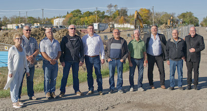 Premier Moe visits Grenfell - Premier Scott Moe (centre) and MLA for Moosomin-Montmartre Kevin Weedmark (far right) visited the construction site of a new long-term care home in Grenfell on Sept. 25. They met with Grenfell Mayor Mark Steininger (third from right), RM of Elcapo Reeve Larry Parrott (second from left) and other members of the Grenfell and District Health Foundation. (Ryan Kiedrowski/Grasslands News)