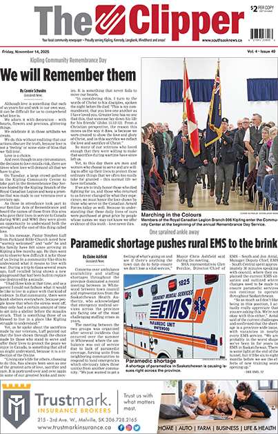 Home Kipling Clipper Kipling Clipper PDF Edition Kipling Clipper – November 14, 2025 Kipling Clipper – November 14, 2025 By Grasslands News Group - November 13, 2025 RELATED ARTICLESMORE FROM AUTHOR Kipling Clipper – November 7, 2025 Indian Head-Wolseley News – November 7, 2025 Kipling Clipper – October 31, 2025 Provincial News First-degree murder charges laid against youth following death in Whitewood RCMP - November 7, 2025 Around 4:00 p.m. November 6, Saskatchewan RCMP received a report of an injured adult male at a residence in Whitewood, SK. Broadview RCMP responded... Arrest made in shooting death of vehicle passenger near Weyburn November 2, 2025 Notice to Subscribers: Canada Post Strike October 9, 2025 Man dies in rollover after fleeing from RCMP August 25, 2025 Standing Buffalo First Nation charts its own course July 22, 2025 Special Sections Hats Off To Our Local Heroes – October 11, 2024 October 10, 2024