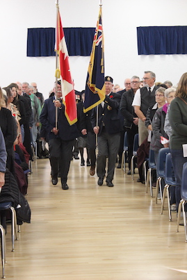 Marching in the Colours - Members of the Royal Canadian Legion Branch 006 Kipling enter the Community Center at the beginning of the annual Remembrance Day Service. (Connie Schwalm/Grasslands News)