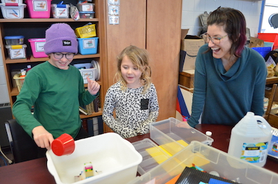 Volcanoes at the library - Librarian Vanessa MacDonald assisted children with creating volcanoes from Lego following a presentation at Indian Head Library on Jan. 30. (Sarah Pacio/Grasslands News)