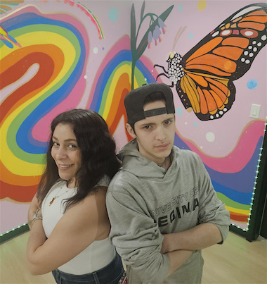 Mural dazzles - Street artist Stephanie Bellefleur and assistant Brad Koochicum stand in front of a mural they painted in the Friendship Centre. (Alan Hustak/Grasslands News)