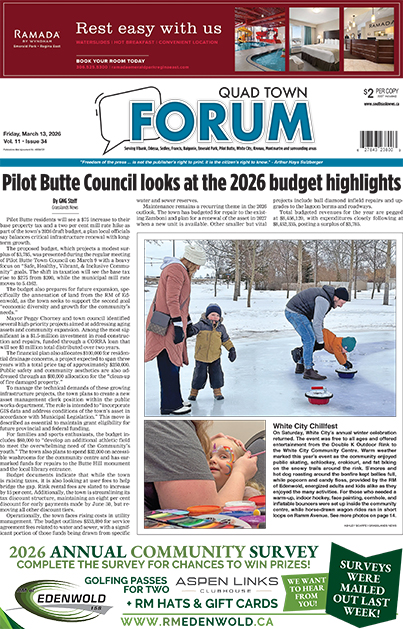 Home Quad Town Forum Quad Town PDF Edition Quad Town Forum – March 13, 2026 Quad Town Forum – March 13, 2026 By Grasslands News Group - March 12, 2026 RELATED ARTICLESMORE FROM AUTHOR Quad Town Forum – May 1, 2026 Quad Town Forum – April 24, 2026 Quad Town Forum – April 17, 2026 Provincial News Five arrested in major drug bust Ryan Kiedrowski - April 27, 2026 NOTE: Grasslands News will have more on this developing story in this week's paper and online. RCMP have provided the following release with regards... Multi-Agency chaos unfolds on Balgonie overpass April 25, 2026 CURRIE – Bonnie April 29, 2026 Carry the Kettle elects new chief April 16, 2026 KOLMAN – David Allen April 29, 2026 Special Sections Hats Off To Our Local Heroes – October 11, 2024 October 10, 2024