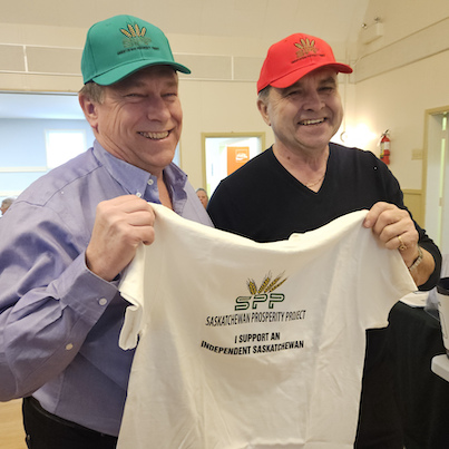 Promoting Saskatchewan sovereignty - SPP President Brad Williams (left) and founder Ed Ramsey display Saskatchewan Prosperity Project merchandise during a town hall meeting in Lipton on Sunday, where the group promoted its push for provincial sovereignty. (Alan Hustak/Grasslands News)