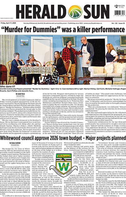 Home Herald Sun Herald Sun PDF Edition Whitewood-Grenfell Herald-Sun – April 17, 2026 Whitewood-Grenfell Herald-Sun – April 17, 2026 By Grasslands News Group - April 16, 2026 RELATED ARTICLESMORE FROM AUTHOR Whitewood-Grenfell Herald-Sun – April 10, 2026 Whitewood-Grenfell Herald-Sun – April 3, 2026 Whitewood-Grenfell Herald-Sun – March 27, 2026 Provincial News FURBER – Kenneth Walter Grasslands News Group - April 1, 2026 We are sad to announce that Ken Furber passed peacefully at home in his sleep on Monday, March 30, 2026. Ken was a tenacious... WICKBERG – Stanley Edlin March 5, 2025 ULMER – Matthew (Matt) Henry April 15, 2026 STEVENSON – Douglas A. April 1, 2026 Sledge Dogs dominate at Western Canada Sledge Hockey Tournament April 16, 2026 Special Sections Hats Off To Our Local Heroes – October 11, 2024 October 10, 2024