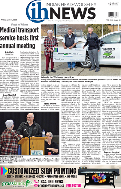 Home IH News IH PDF Edition Indian Head-Wolseley News – April 24, 2026 Indian Head-Wolseley News – April 24, 2026 By Grasslands News Group - April 23, 2026 RELATED ARTICLESMORE FROM AUTHOR Indian Head-Wolseley News – April 17, 2026 Indian Head-Wolseley News – April 10, 2026 Indian Head-Wolseley News – April 3, 2026 Provincial News FURBER – Kenneth Walter Grasslands News Group - April 1, 2026 We are sad to announce that Ken Furber passed peacefully at home in his sleep on Monday, March 30, 2026. Ken was a tenacious... WICKBERG – Stanley Edlin March 5, 2025 ULMER – Matthew (Matt) Henry April 15, 2026 STRATTON – Heather April 22, 2026 STEVENSON – Douglas A. April 1, 2026 Special Sections Hats Off To Our Local Heroes – October 11, 2024 October 10, 2024